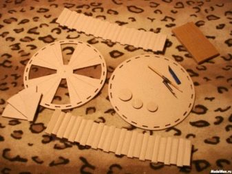 Итак, начнем сборку. Для постройки игрушки нам потребуется сделать из картона два круга, размер которых соответствует параметрам вашего питомца. На одной из окружностей вырезаем проход для хомячка. Далее по кругу делаем по краям маленькие зазубрины в виде треугольников. Также вырежем стенку и основу, к которым будет крепиться окружность. Дорожку следует вырезать в соответствии с прямоугольными вырезками на окружностях.